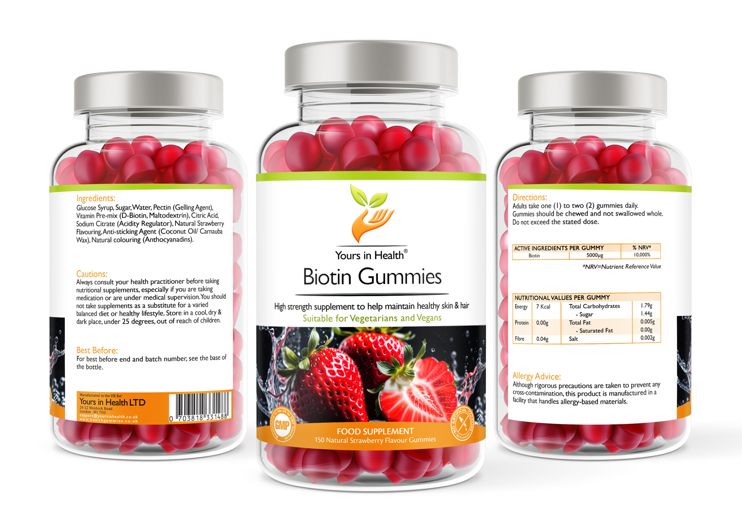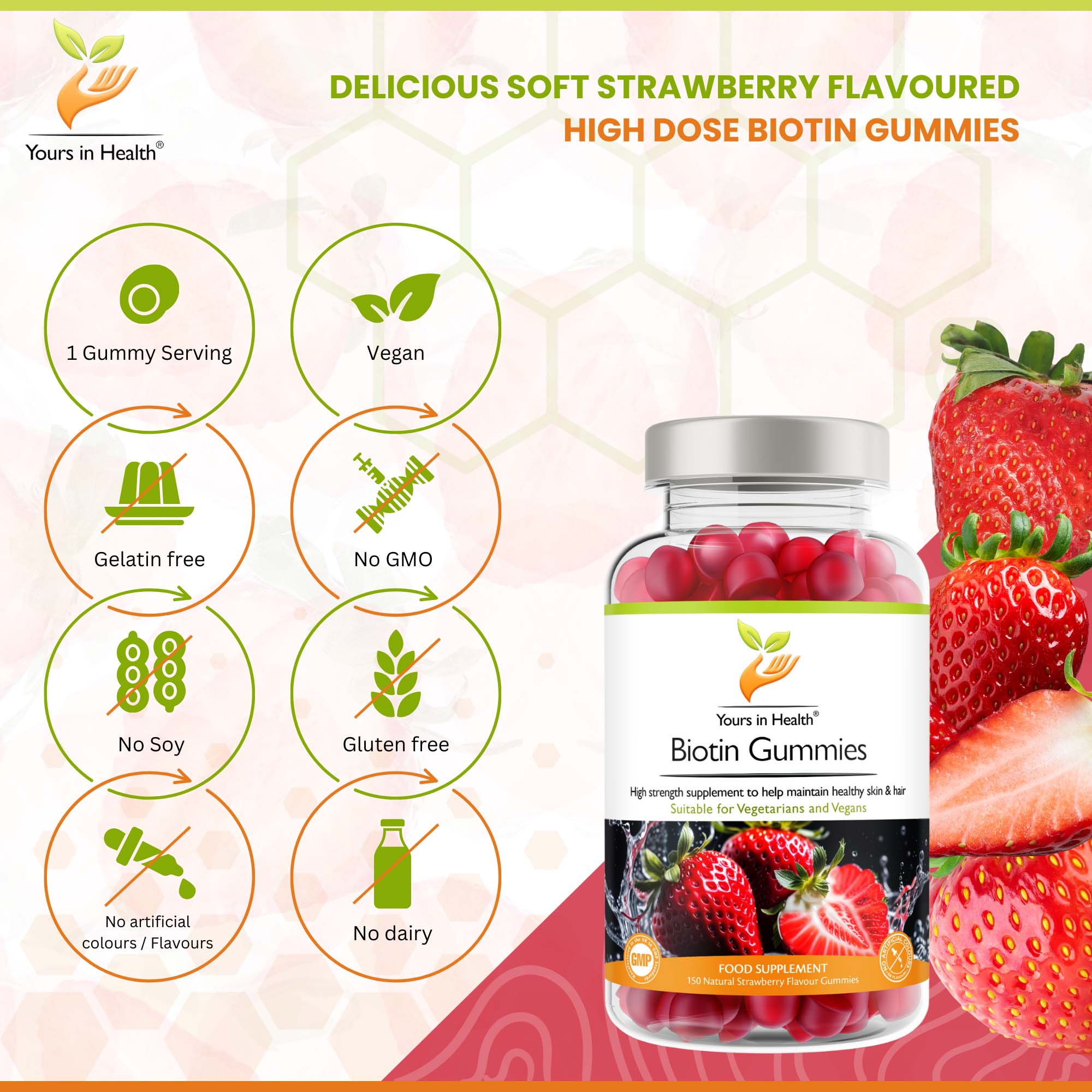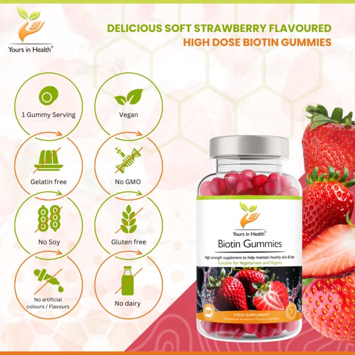 Biotin 5000μg – 150 Natural Strawberry Flavour Gummies is suitable for vegetarians and vegans, making it a great option for those who follow a plant-based diet.