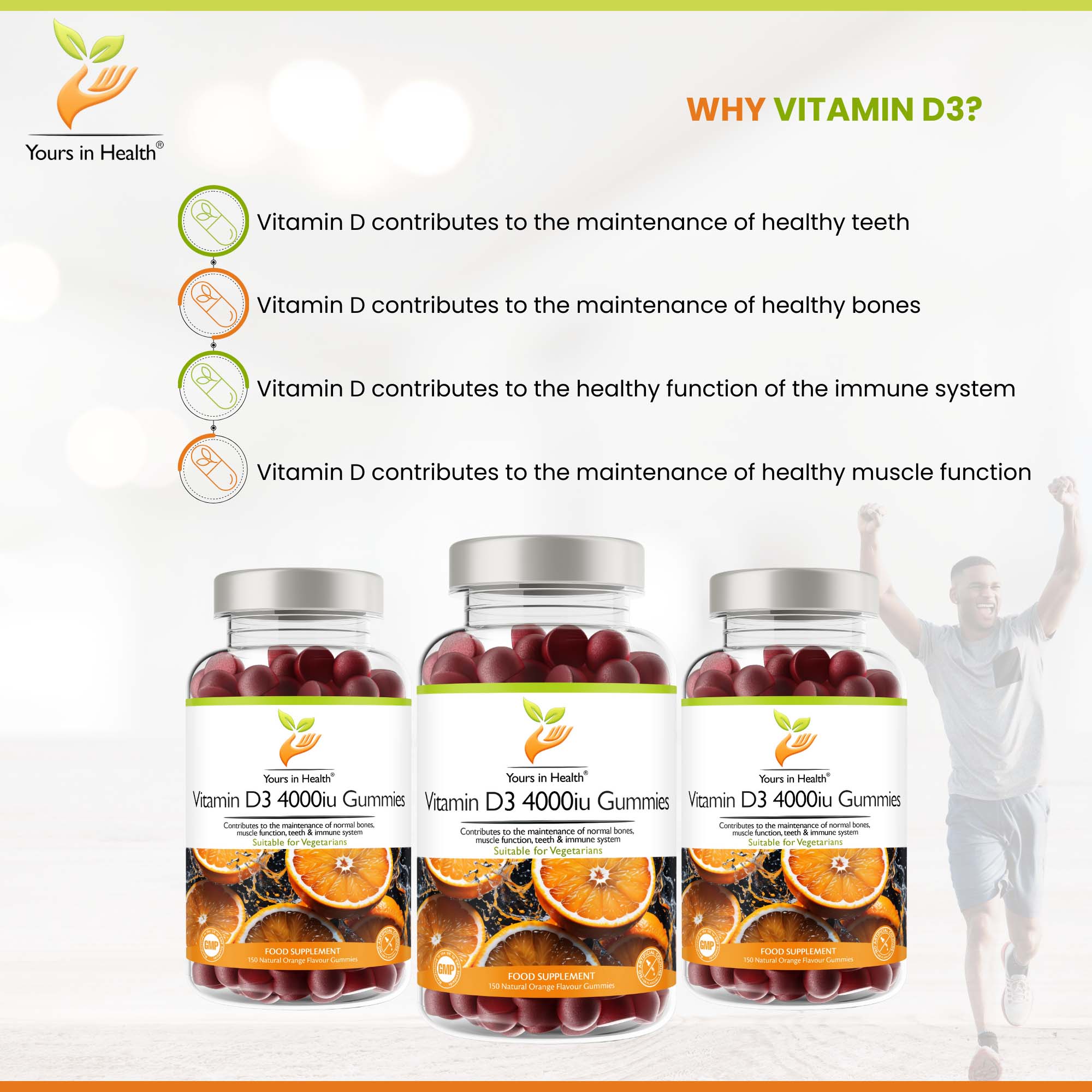 Our gummies are made with high-quality ingredients and are a convenient and easy way to get your daily dose of vitamin D. The natural orange flavour adds a refreshing taste to the gummies, making them a perfect on-the-go snack that you love.